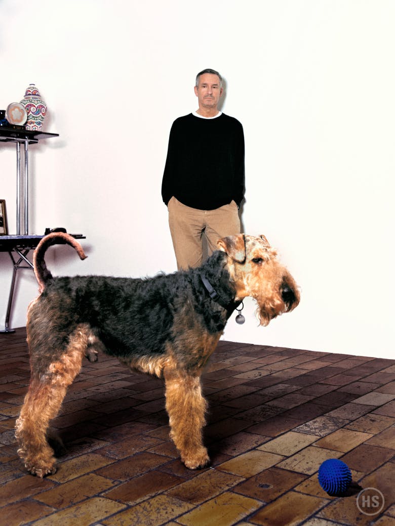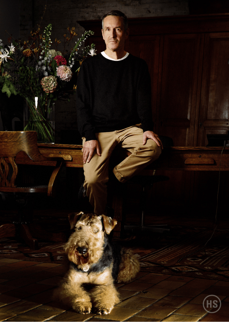 It’s 8 a.m. on a Thursday, New York time, 2 p.m. in Antwerp. I’m speaking over Zoom to Dries Van Noten for the third time in the same number of years. This is the third time I’ve seen the same brick wall framed by the same corner of the same wooden cabinet with the same bowl or plate or whatever balanced atop it. Van Noten is wearing the same navy sweater and loosely coiled bluish-greenish scarf. He’s even sitting in the same pose: head tilted into an upward-turned right hand that’s gently clasping the side of his face. Rodin’s “The Designer.” As always, he pauses to thoughtfully consider each of my silly little questions, eyes flitting to the ceiling, before answering in the same crisp, chambré timbre.