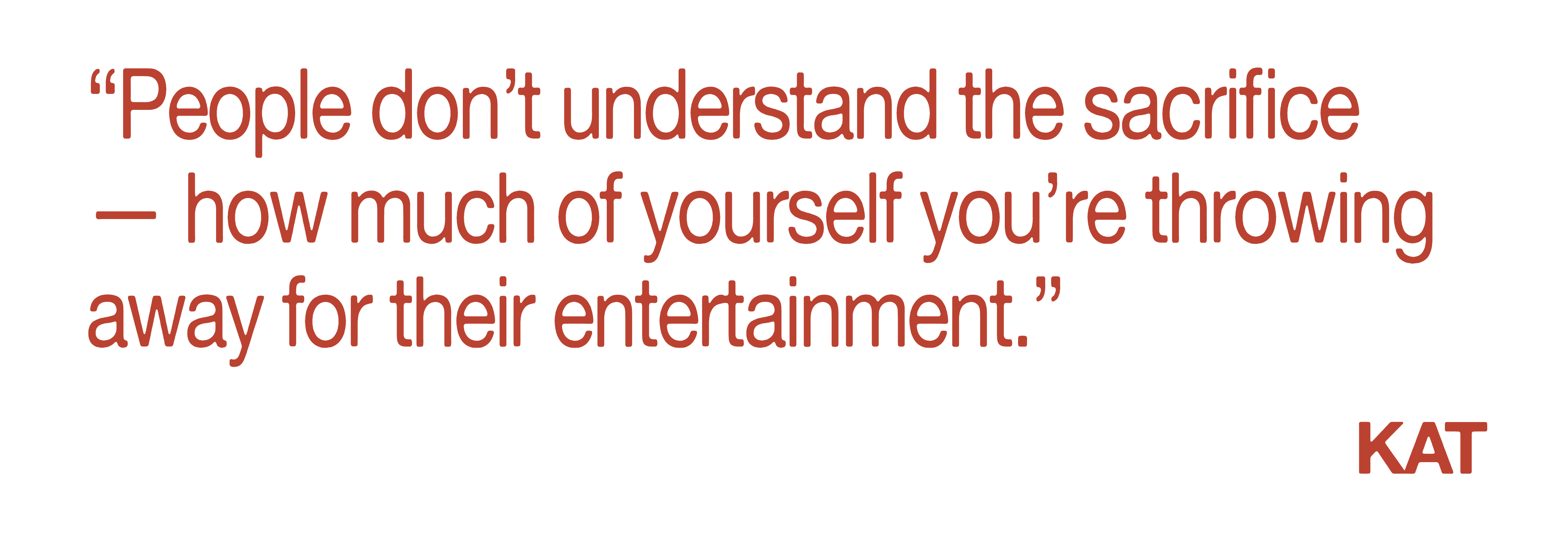 KAT: They don’t understand the sacrifice, how much of yourself you’re throwing away for their entertainment. You can never get it back. I remember thinking when my mom passed, “I’m getting funeral arrangements ready, and people don’t realize I’ve given a whole part of my life with her away.”