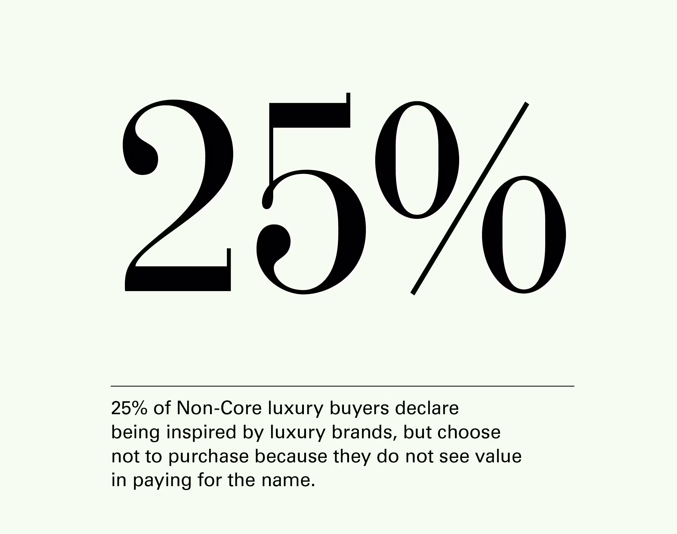 Core Luxury Consumers will, in short, buy into brands that get them – that speak to instead of talking at them. In a micro sense, this means mix-and-match pieces that allow for seamless wardrobe integration. On a macro level, we see this stat as a call for brands to stop dictating and start resonating, to ditch the larger-than-life logos and focus on craft.