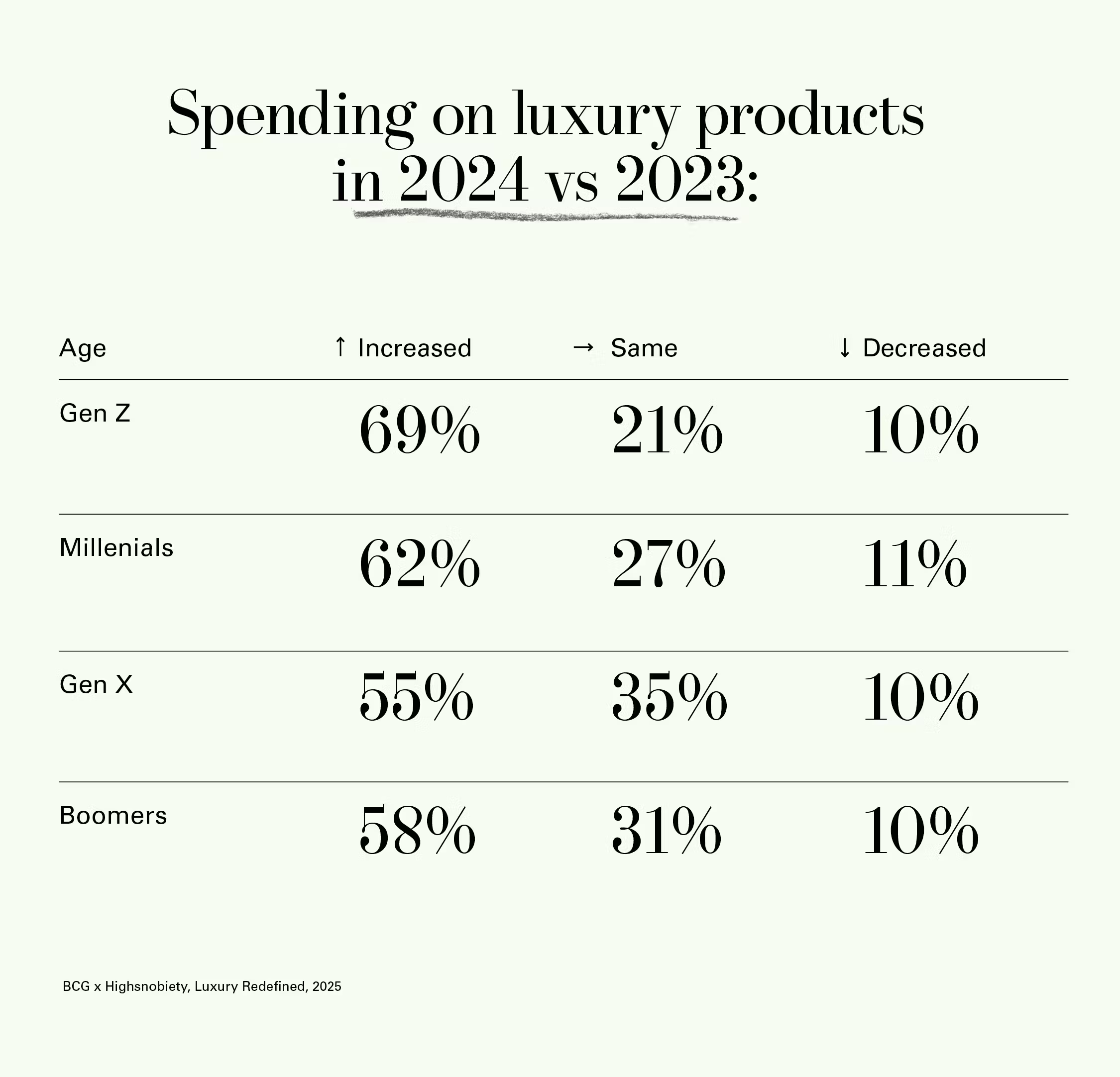 Luxury consumers are spending as much as ever, especially younger ones. To the question of how the amount they spent on luxury products in 2023 changed in 2024, the largest percentage of respondents (from each generation, in every market, across genders) answered that their spending increased. The smallest percentage of respondents answered that it decreased (with more saying it stayed the same).