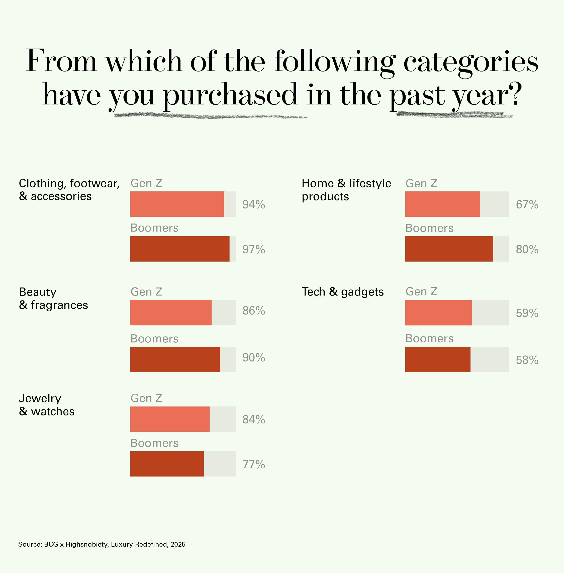 The younger set are even investing almost as much in non-fashion purchases, such as homeware and beauty products, as they are in clothing, shoes, bags, and sunglasses. In fact, our survey shows that Gen Z and millennials are more likely to buy jewelry and watches than their Gen X and boomer counterparts.