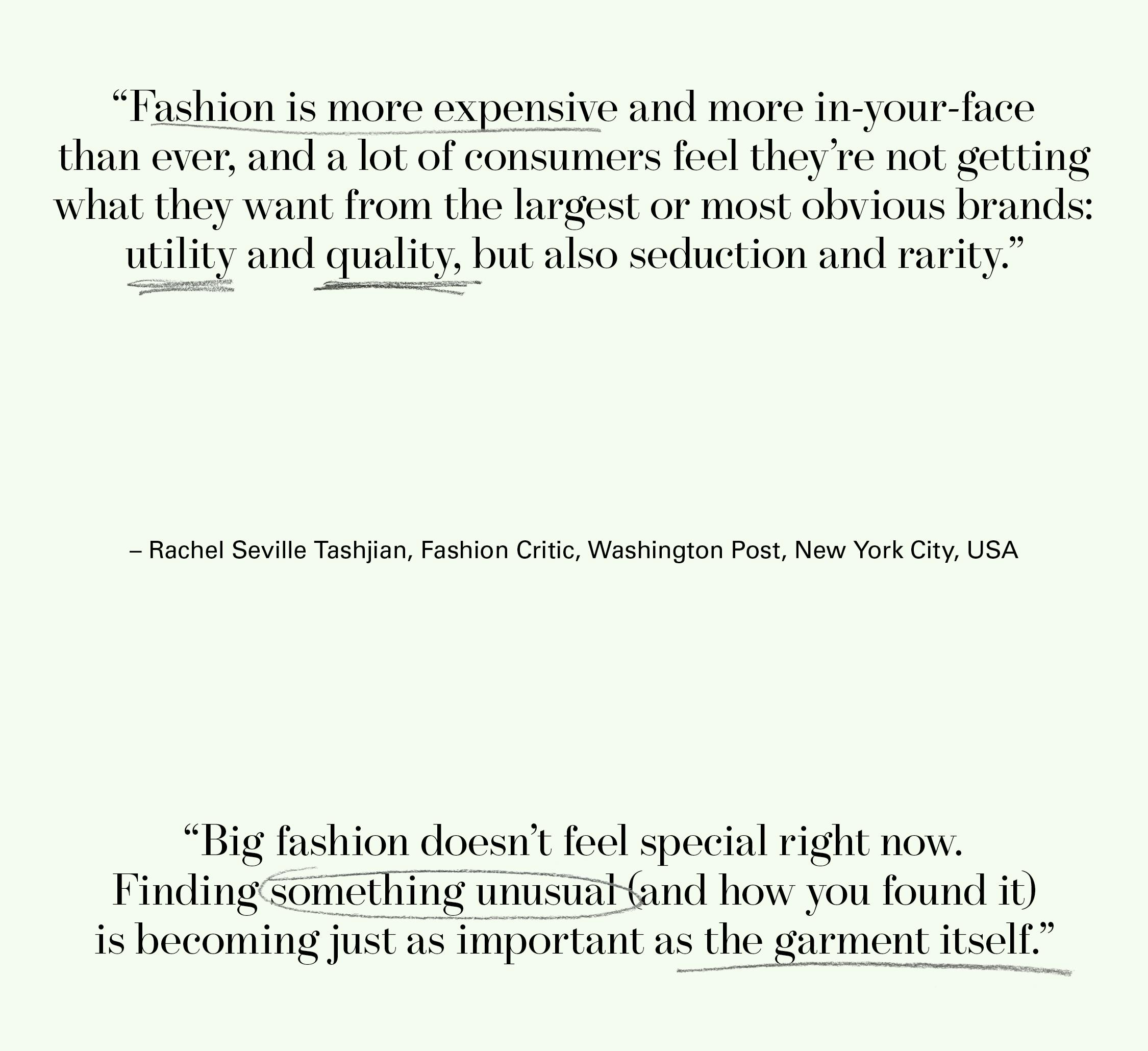 Challenges deepen when providing for everyone, with multiple collections per season, eventually means pleasing no one. The pressure to make larger profits, compete with dissimilar brands, and answer to broadly mined data and irrelevant consumer trends inevitably distracts and waters down ideas. Eventually, more attention is paid to one-size-fits-all departments and to remaking best-sellers as opposed to experimentation.