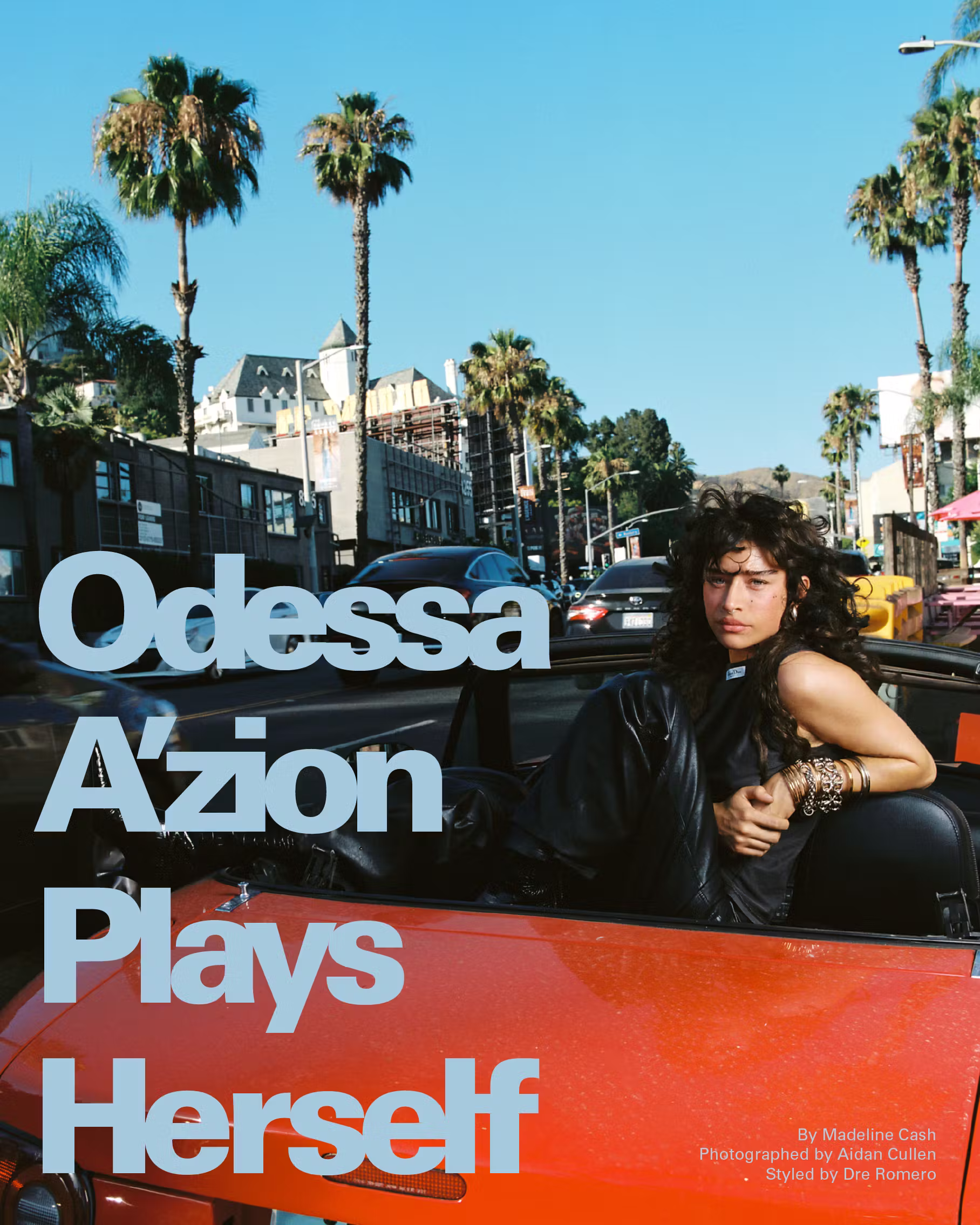 She’ll also appear in Rachel Sennott’s HBO comedy series, I Love LA, which comes out in November. A’zion plays Tallulah, a character unlike any she has yet taken on. Without revealing too much: “She’s femme. Like, tits-out femme. She’s confrontational in a way that I’m not,” A’zion says. “Even just wearing her clothes — tiny, slutty little dresses — I didn’t feel like myself. It gave me a little bit of an identity crisis.” She describes Tallulah as smart, manipulative, and unpredictable, though not without empathy. “When we were casting, we were struggling to find someone who could bring the comedy but also the truth and emotional depth to the character,” Sennott says. “Once we saw Odessa, everything just clicked.”