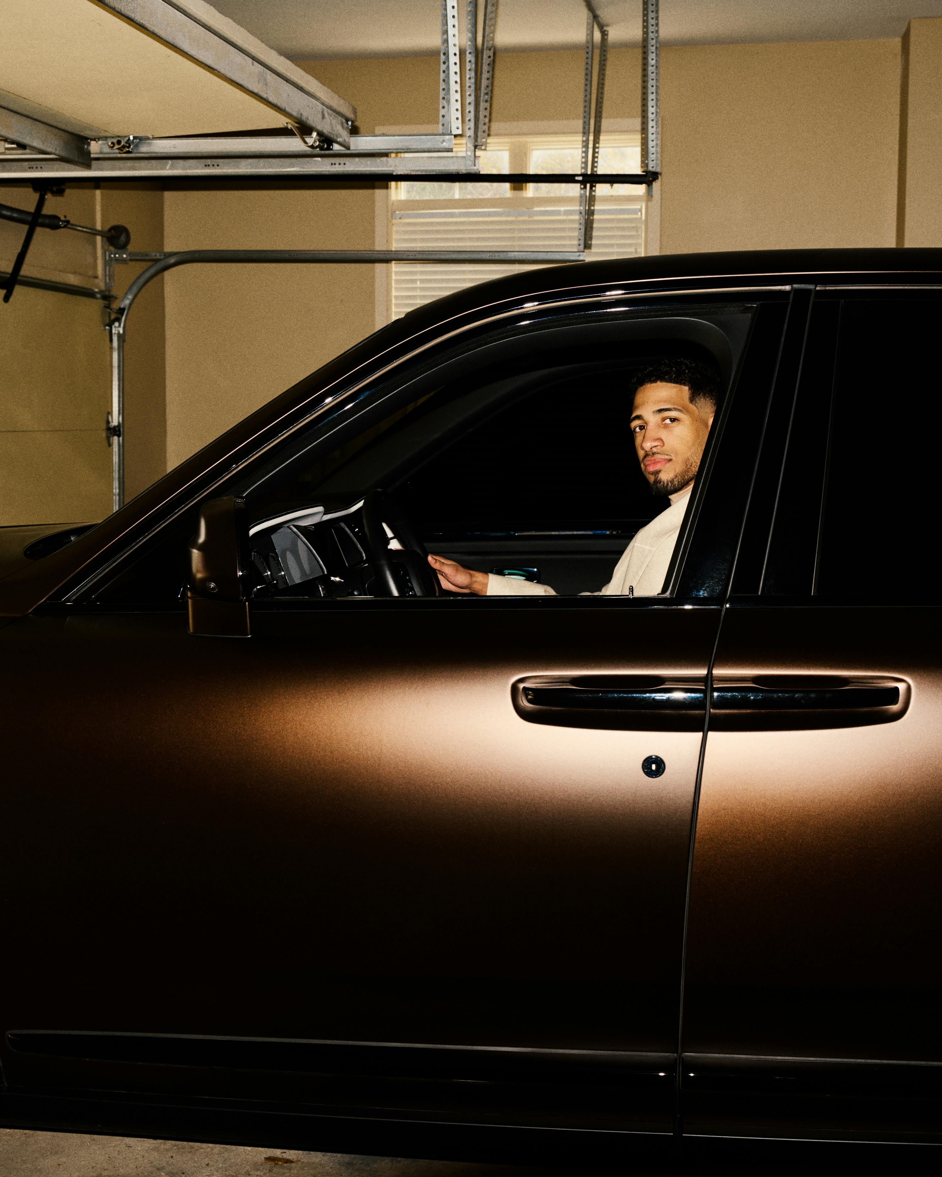 Shortly after 11am on a sunny spring morning, the iron gates swing open and we enter the subdivision where Tyrese Haliburton lives in suburban Indiana. When we reach his home at the end of a quiet cul-de-sac, the garage door opens theatrically, revealing a frosted brown Rolls-Royce Cullinan, some stray leaves, and a stack of Prime Energy and Fiji water bottles on the ground. Inside, we’re greeted by an excited brown doodle puppy named Ames and directed downstairs to the basement, where Tyrsese reclines in a barber chair, having just finished a fresh lineup.