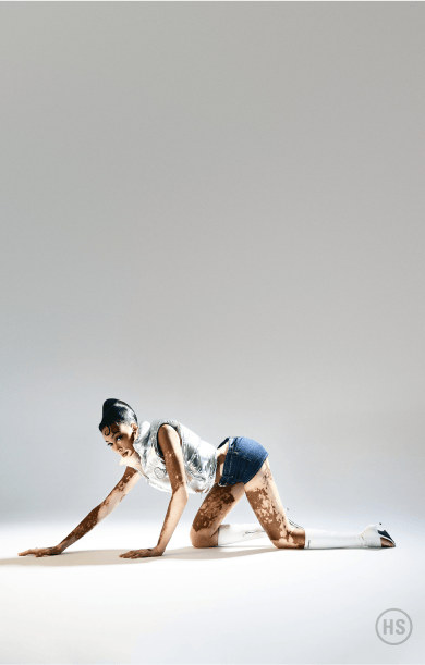 Harlow’s life hasn’t always been this picturesque. When the model, born Chantelle Whitney Brown-Young, was four, she began developing white patches on her otherwise melanated skin, a symptom of the auto-immune condition vitiligo. Though Harlow was lucky enough to grow up in a supportive home — her grandmother, who once reprimanded her mother for pointing out the spots, stressed how important it was for the young girl to feel confident in herself — she still struggled at school, where her peers teased her by calling her names like “zebra” and “cow.” “I always felt alienated,” she admits of her childhood. “When I was a kid, I felt so much like I was the only person in the world with vitiligo.”